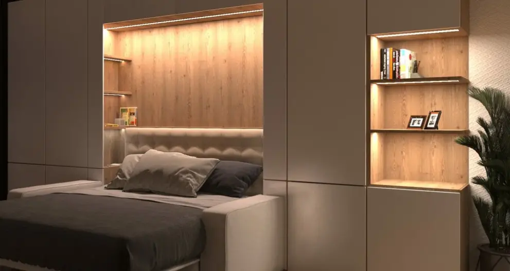 Сделаем шкаф‑кровать под вашу комнату: размеры, фасады и цвет, наполнение (полки/шкафы/антресоли). Учтём ниши, плинтус, розетки и выступы — чтобы всё встало точно и выглядело как встроенное.